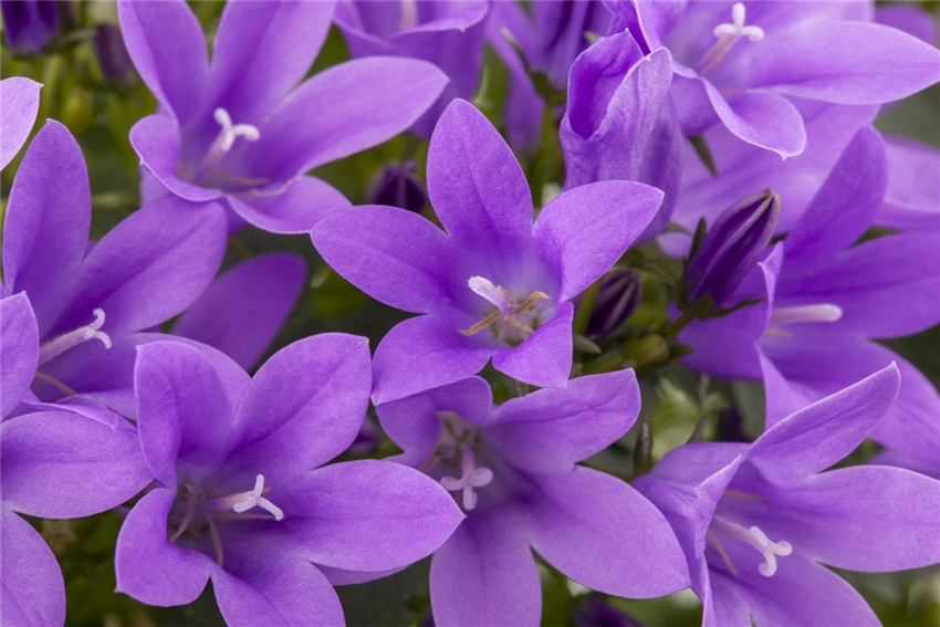 Die Blüten der Glockenblume blühen weiß oder in allen erdenklichen Blau- und Violetttönen. Und dabei machen die Blüten dem Namen der Pflanze alle Ehre. Die Glockenblume besitzt je nach Art glocken-, röhren- oder sternförmige Blüten. Die Blütezeit der Glockenblume liegt zwischen Juni und September. Das macht sie zu einer Pflanze mit einem unschätzbaren Wert für den Garten. Ihren Blüten verdankt die Glockenblume auch ihren botanischen Namen, Campanula. Das bedeutet aus dem Lateinischen übersetzt so viel wie „Glöckchen“. Eine weitere Besonderheit: auch die Anordnung der Blüten ist von Art zu Art unterschiedlich. Mal sind die Blüten als Rispen oder Trauben angeordnet, oft aber auch einzeln.