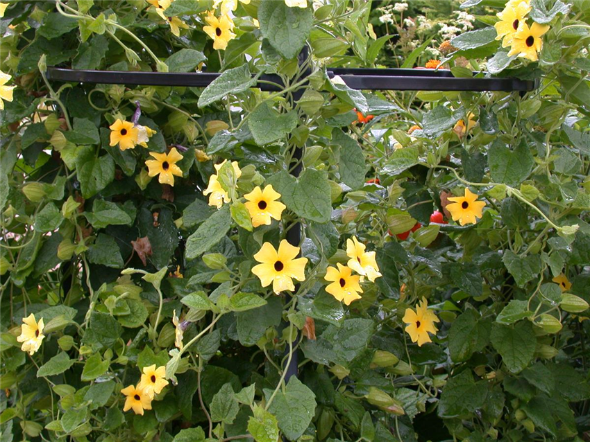 Wer sich nicht ganz sicher ist, ob er Kletterpflanzen in seinem Garten haben möchte, der kann auch Kletterprofis auf Probe in den Garten holen. Einjährige Kletterpflanzen eignen sich besonders gut für kurzfristige Begrünung mit Kletterpflanzen und in nur einer Saison breiten sie sich auf mehreren Metern rasend schnell aus. Dabei können einjährige Kletterpflanzen genauso vielfältig eingesetzt werden, wie ihre mehrjährigen Geschwister. Duftwicke, Kapuzinerkresse und Schwarzäugige Susanne eignen sich besonders gut für das Beet an einer Rankhilfe. Maurandie und Prunkwinde machen sich gut an Hauswänden und sind ein hübscher blühender Sichtschutz. Ganze Pavillons und Pergolen erklimmen in einer Saison Zierkürbis, Glockenrebe, Japanischer Hopfen und die Feuerbohne.