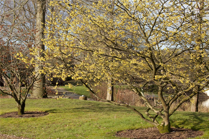 Wer sich eine Zaubernuss in den eigenen Garten holt, der bekommt einen pflegeleichten und anspruchslosen Begleiter, der viele Jahre für Farbe im Winter sorgen wird. Dabei kann man die unterschiedlichsten Gartenstile mit dem Gehölz bereichern. Vor allem aber in einem naturnahen Garten darf die Zaubernuss auf keinen Fall fehlen. Die Krone der Pflanze kann bis zu 5 Meter breit werden und benötigt ausreichend Platz. Als Solitär macht die Zaubernuss daher eine richtig gute Figur. Vor einer dunklen Eibenhecke kommen die bunten Blüten noch besser zur Geltung und in kleinen Gruppen gepflanzt kann man die unterschiedlichsten Blütenfarben kombinieren. Wichtig ist, dass man dabei einen gewissen Pflanzabstand einhält und auf lange Sicht mit ca. 16m² pro Pflanze rechnet. Denn obwohl die Zaubernuss recht langsam wächst, kann sie mit den Jahren eine beachtliche Größe erreichen und sticht dann mit Sicherheit noch mehr ins Auge.