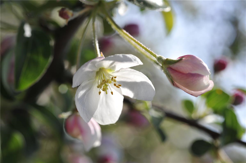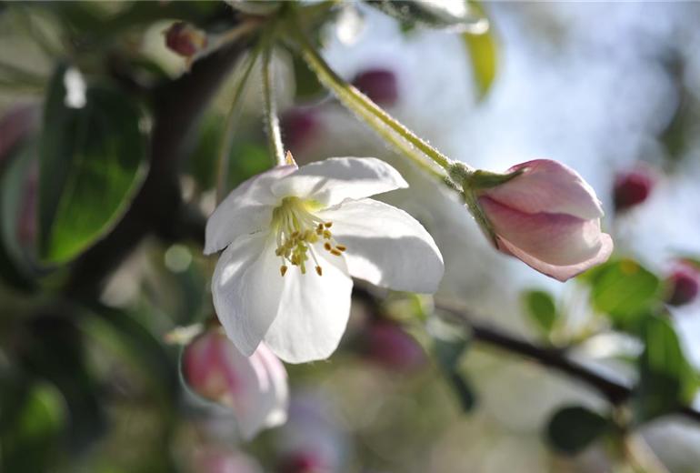 Ein Apfelbaum benötigt viel Raum, um sich im Laufe von Jahren und Jahrzehnten opulent zu entwickeln. Hochstämmige Apfelbäume brauchen oft mehr als 60 Quadratmeter Platz. Aus diesem Grund ist es nicht empfehlenswert, Apfelbäume zu eng aneinander oder in die Nähe von Gemüsebeeten zu pflanzen. Der Schattenwurf des Apfelbaums kann andere Pflanzen in ihrem Wuchs behindern. In kleinen Gärten empfehlen sich spezielle Säulenzüchtungen oder Spalierobst. Solche Apfelbäume benötigen weniger Spielraum und können daher auf großen Terrassen oder auf kleinen Grundstücken viele Früchte tragen. Spalierobst macht im Schrebergarten oder in einem geräumigen Pflanztopf eine gute Figur und sorgt für eigene, schmackhafte Früchte. Generell gilt: Wer eine reiche Apfelernte im Blick hat, muss dafür sorgen, dass eine Befruchtung der Blüten möglich ist.