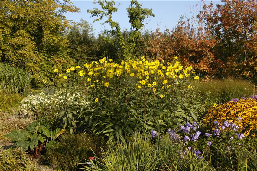 Bei der Gestaltung von Beeten mit Sonnenstauden, aber auch generell mit Staudenarten, sollte ebenfalls auf geeignete Begleitpflanzen geachtet werden. Mit einer solchen Pflanzenart, die sich durch die gesamte Beetgestaltung zieht, werden alle Stauden miteinander verbunden, was für ein harmonisches Gesamtbild sorgt. Besonders beliebt und sehr gut geeignet sind verschiedene Ziergräser, aber auch niedrigere Staudenarten, die die Lücken zwischen den größeren Sonnenstauden füllen. Harmonie in einer Anpflanzung kann auch durch die Wahl der Farben erreicht werden. Bleiben die Blüten in einem bestimmten gewählten Farbspektrum, rundet dies die Wirkung zu einem harmonischen Ganzen ab. In einem solche harmonischen Beet können bestimmte Sonnenstauden besonders gut zur Wirkung kommen und in der Sonne erstrahlen.