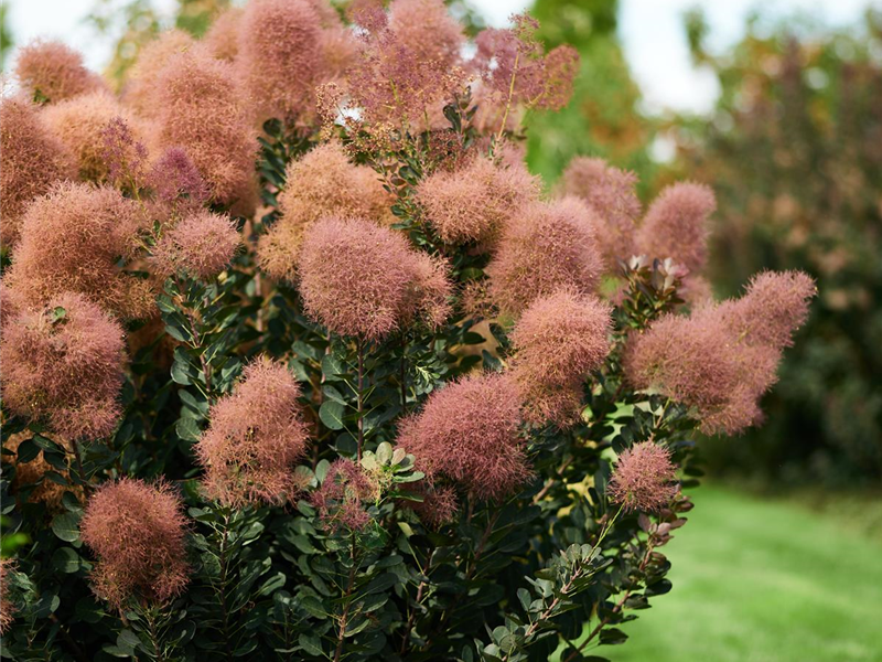'Magical Torch'® ist filigraner als die bekannte Sorte ‚Royal Purple‘, er wird bis zu 2,5 Meter hoch und hat einen aufrechten, fast säulenartigen Habitus. Die dunkelrotbraunen, zarten Blätter zeigen im Licht ein wunderbares Farbspiel. Die großen, bauschigen Fruchtstände gehen aus dekorativen dunkelrosa Blüten hervor, die besonders zahlreich auftreten.